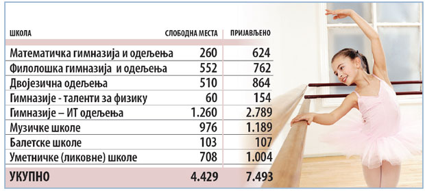 Za sva dvojezička i odeljenja učenika nadarenih za fiziku, matematiku ili informatiku, kao i za umetničke škole, predviđen je upis 4.429 prvaka, a prijavila su se 7.493 mala maturanta.