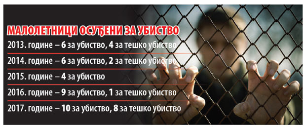 Tinejdžeri su u poslednjih pet godina ubili 50 ljudi, pokazuju uporedni podaci Republičkog zavoda za statistiku. Najviše njih osuđeno je za ubistvo i teško ubistvo prošle godine - čak 18. Godinu pre toga osuđeno je 10 maloletnika, od kojih petoro šesnaestogodišnjaka.