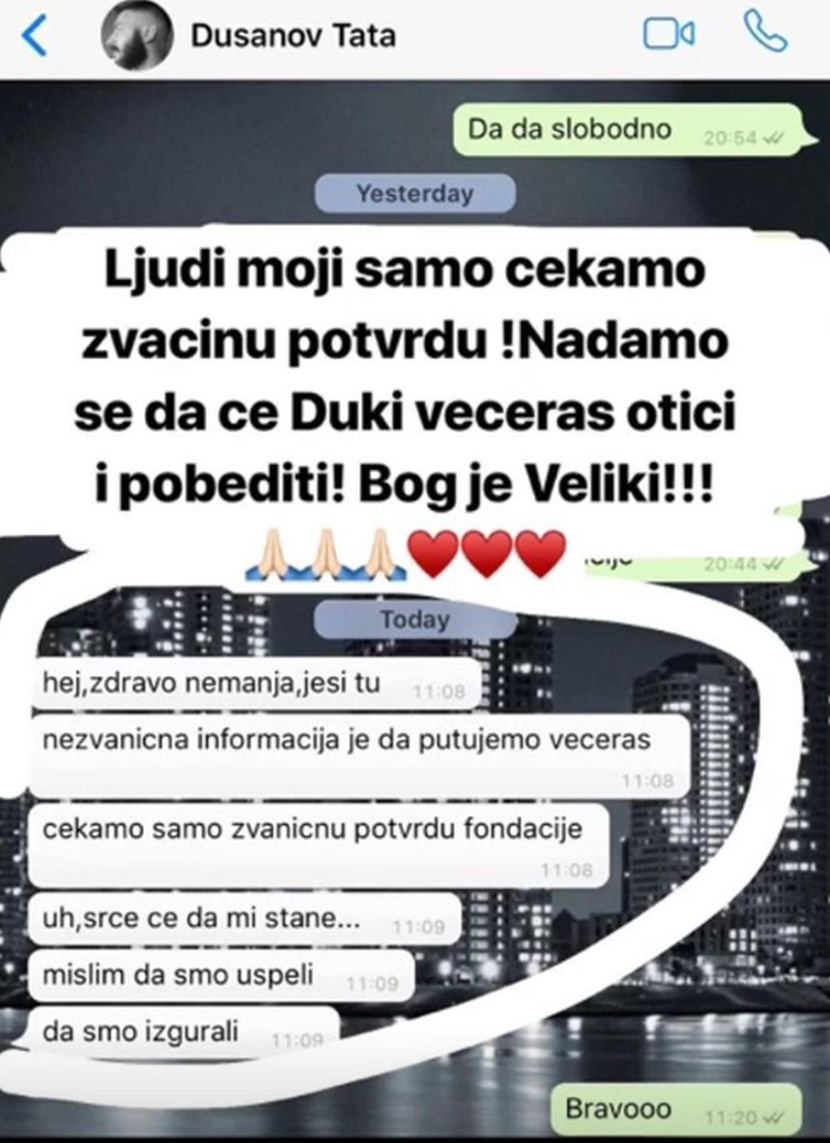 Prema informaciji koju je podelio Nemanja R. Miletić, koji je bio jedan od glavnih pokretača humanitarnih akcija za Dukija, četvorogodišnji mališan će u toku večeri otpuotvati u Barselonu.