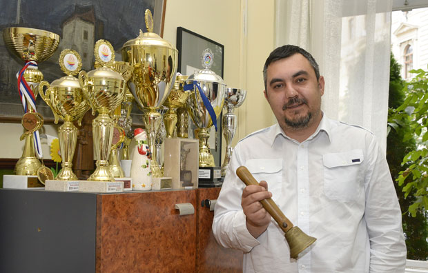 Direktor škole Mladen Stevanović sa zvonom koje decenijama označava početak i kraj časa