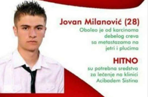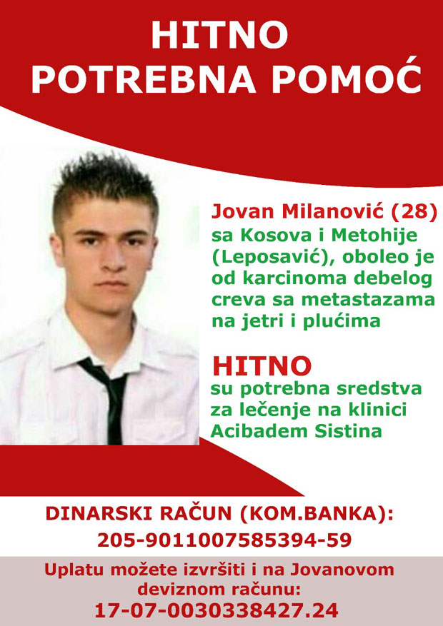 Karcinom debelog creva sa metastazama na jetri i plućima ozbiljno ugrožava život dvadesetosmogodišnjeg Jovana Milanovića iz Leposavića. Podmukla bolest, čiji simptomi su otkriveni sredinom prošle godine, napala je Jovanova telo, a operacija i brojne hemoterapije koje je do sada primio nisu dali željene rezultate.