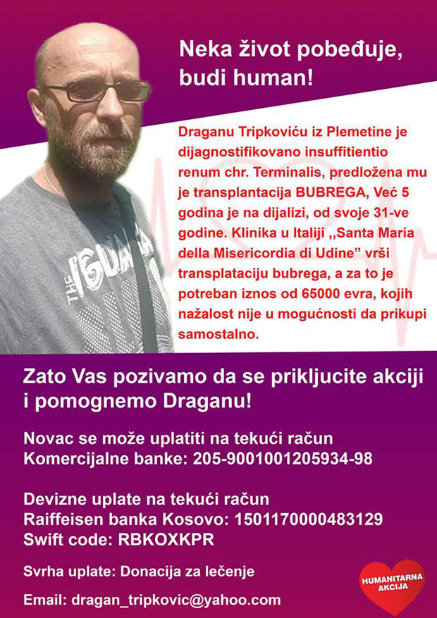 Inače, 31-godišnji Dragan ima teško bubrežno oboljenje i već pet godina se nalazi na dijalizi, međutim, sada je predložena transplatacija bubrega za koju je u Italiji neophodno idvojiti 65.000 evra a svi humani ljudi koji žele da pomognu ovom mladm čoveku da pobedi bolest mogu uplatiti novac na račun Komercijalne banke: 205-9001001205934-98 ili u Rajfajzen banci na Kosovu na: 150117000483129, sa naznakom da je u pitanju donacija za lečenje Dragana Tripkovića.