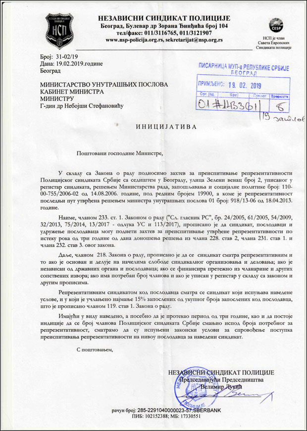 Nezavisni sindikat policije je danas, nakon više od tri godine, uputio inicijativu nadležnima za preispitivanje reprezentativnosti Policijskog sindikata Srbije, a njihovo saopštenje prenosimo u celosti
