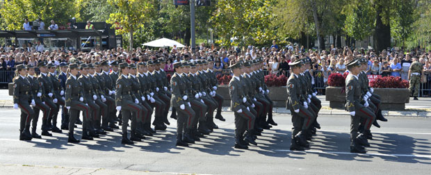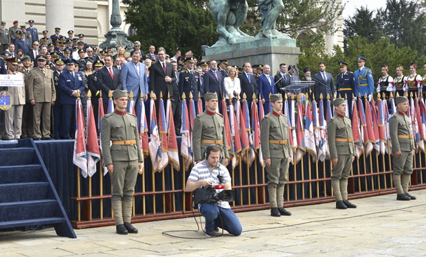 "Neka vaše sablje bljesnu u paradnom stroju, neka srpski stegovi budu snažno podignuti u vazduh. Vi ste garant mirne i spokojne države, nama jedino voljene Srbije“, naglasio je Vučić.