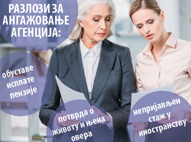 U Srbiji posluju agencije koje prikupljaju papire za regulisanje završetka radnog veka. Za iznos od oko 10.000 dinara posao završavaju oni kojima se potpiše punomoć. Agencije preračunavaju i kolika će biti penzija