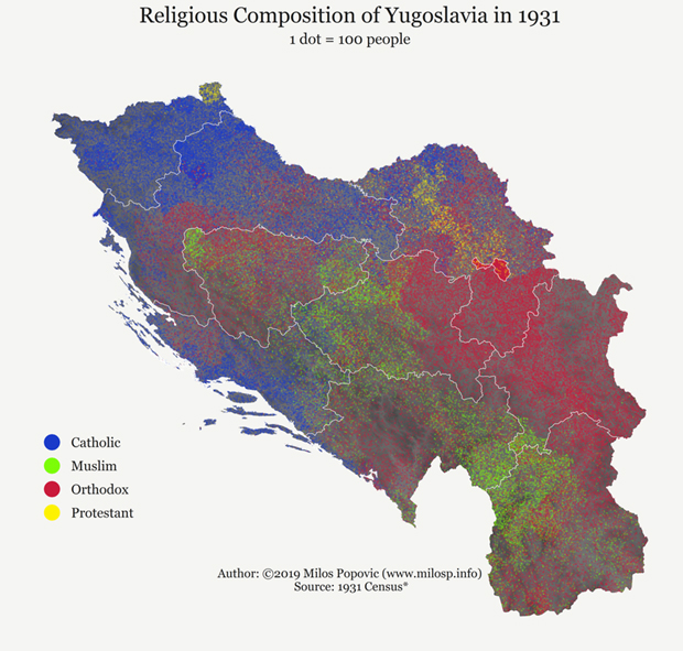Na mapi su tačkice različitih boja od kojih svaka predstavlja po 100 stanovnika. Plavom su označeni katolici, zelenom muslimani, crvenom pravoslavci, dok su protestanti “obojeni” u žuto.