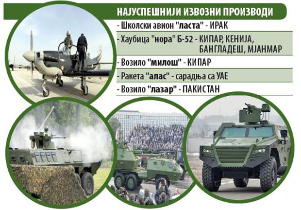 PRODAJA oružja, municije i vojne opreme tokom protekle decenije bio je jedan od najvažnijih državnih poslova kojim je smanjivan spoljnotrgovinski deficit Srbije. Za srpsko oružje zainteresovani su partneri u svim delovima sveta. Prema podacima za 2017. godinu najveći pojedinačni kupci srpskog naoružanja su Ujedinjeni Arapski Emirati, Saudijska Arabija i SAD. Na mapi izvoza su i zemlje Srednje Azije, Severne Afrike, a odnedavno i EU. Najveći poslovi prethodnih godina sklopljeni su sa Irakom, Bangladešom, Kenijom, Alžirom, Mjanmarskom unijom.