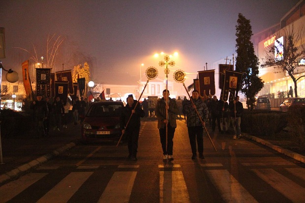 Nakon molebana u crkvi više stotina građana noseći transparente i ikone prošetalo je centralnim gradskim saobraćajnicama i podržalo srpski narod u Crnoj Gori.
