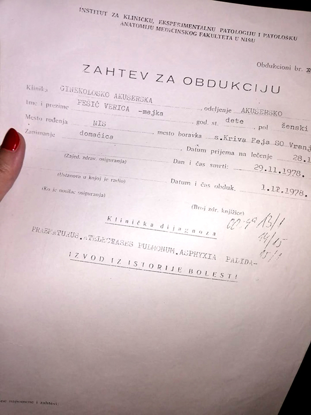 Očajna majka provela je dve nedelje u niškoj bolnici i kaže da je to bila prava agonija. Stalno je insistirala da vidi mrtvo dete, ali je zbog te upornosti prebačena u drugu sobu i dati su joj lekovi. Iz bolnice je izašla bez ijednog dokumenta. Obećali su da će im ih poslati poštom, ali nikada nije stigla na njihovu adresu. Kada je kasnije, kako tvrdi, krenula da traga za dokumentacijom, saznala je da je jedno dete, devojčica, upisano u knjigu rođenih, ali ne i u knjigu umrlih. Osim toga nema ni potvrde o smrti, već samo neki lažni zahtev za obdukciju. U više navrata dok je tražila dokumentaciju u bolnici, tvrdi i da je videla da stoje dve bebe na porođaju. Čak joj je i medicinska sestra koja je radila u boksu za decu to potvrdila.
