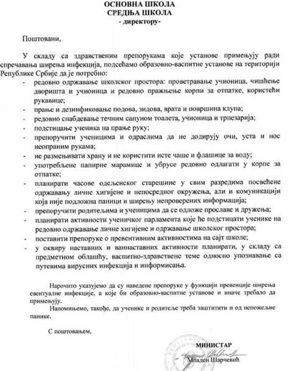U toku dana stiglo je obaveštenje za roditelje od direktora škola u koje idu njihova deca sa nizom specijalnih mera koje se uvode i koje bi trebalo da se poštuju