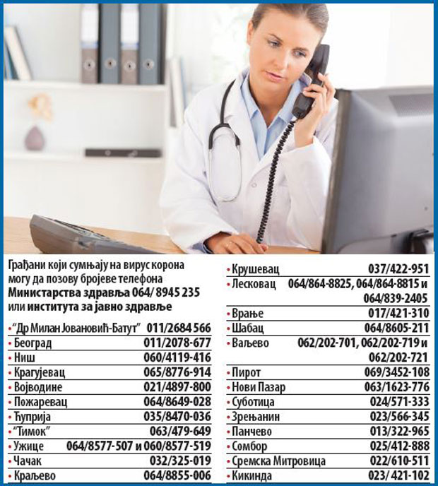 Svako ko zbog tegoba koje su karakteristične za infekciju virusom korona posumnja da je zaražen, ne bi trebalo da odlazi u dom zdravlja ili druge zdravstvene ustanove, nego da se prvo javi telefonom dežurnoj epidemiološkoj službi.