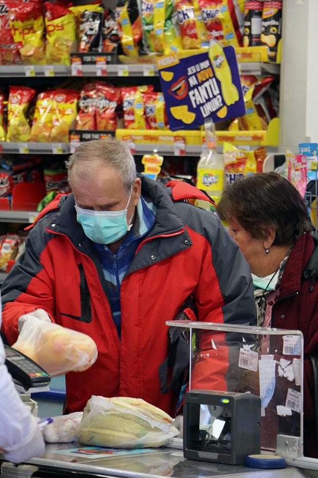U kafićima je značajno manji broj gostiju, a u radnjama nešto veći broj kupaca od uobičajenog za ovo doba dana. U prodavnicima velikih trgovinskih lanaca ima svih osnovnih životnih namirnica, a zalihe su u odnosu na juče i dopunjene. Međutim, ima radnji gde su rafovi sa brašnom ostali prazni, a tražen je i sveži i suvi kvasac. Opustošeni su i delovi jedne prodavnice u kojima su izložene gotove supe. Zaposleni na kasama, u pojedinim prodavnicima, rade sa zaštitnim rukavicama, a u nekima povremeno dezinfikuju ruke adekvatnim sredstvima. U leskovačkim apotekama danima nema zaštitnih maski i rukavica, kao ni sredstava za suvo pranje ruku i alkohola. Ova sredstva su se u ponedeljak pojavila u pojedinim apotekama, ali su ubrzo i prodata, uprkos ograničenjima u količinama koje su mogle da se kupe.