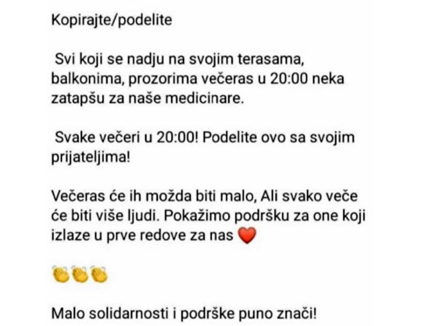 Svi koji se nađu na svojim terasama, balkonima, prozorima večeras u 20 časova neka zatapšu za naše medicinare. Svake večeri u 20 časova! Podelite sa svojim prijateljima!