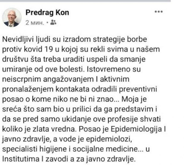 - Nevidljivi ljudi su izradom strategije borbe protiv Covid 19 u kojoj su rekli svima u našem društvu šta treba uraditi uspeli da smanje umiranje od ove bolesti. Istovremeno su neiscrpnim angažovanjem i aktivnim pronalaženjem kontakata odradili preventivni posao o kome niko ne bi ni znao... Moja je sreća što sam bio u prilici da ga predstavim i da se pred samo ukidanje ove profesije shvati koliko je zlata vredna. Posao je Epidemiologija i javno zdravlje, a vode je epidemiolozi, specialisti higijene i socijalne medicine... u Institutima i Zavodi a za javno zdravlje - napisao je Dr Kon.