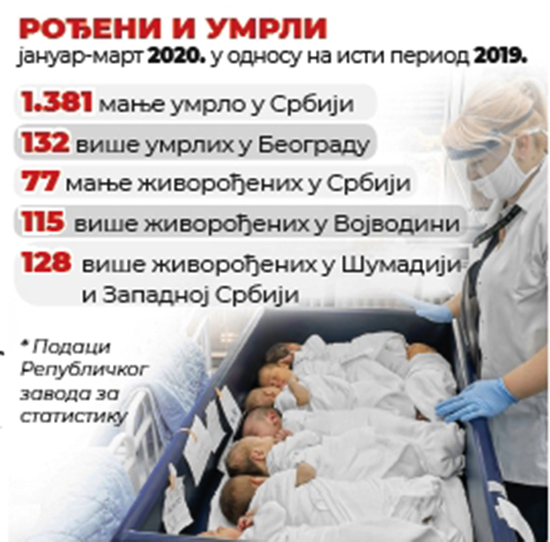 Što se tiče broja živorođenih, on je na nivou Srbije, prema preliminarnim rezultatima, za 77 manji ove nego u istom periodu 2019. godine, odnosno za 0,5 odsto. Porast broja beba beleži se ipak u Vojvodini, Šumadiji i Zapadnoj Srbiji. U Vojvodini je između januara i marta 2020. rođeno 115 beba više nego lane, odnosno za 3,2 odsto. U Šumadiji i Zapadnoj Srbiji u istom periodu rođeno je za 128 dece više, tj. za 2,7 odsto.