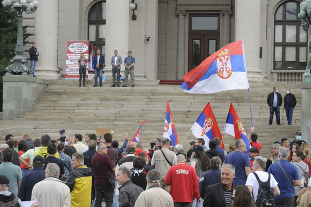 ISPRED zgrade Skupštine Srbije u nedelju posle podne su se okupile pristalice Dveri i Saveza za Srbiju kako bi pružili podršku predsedniku Dveri Bošku Obradoviću i njegovom zameniku Ivanu Kostiću. Obradović je pre osam dana započeo štrajk glađu na stepeništu ispred Skupštine, a nekoliko dana kasnije pridružio mu se i Kostić. Oni zahtevaju organizovanje dijaloga opozicije i vlasti, odlaganje izbora, kao i gostovanje u jednočasovnoj emisiji na RTS. Okupljeni su na skup pozvani preko društvenih mreža, a Obradović tvrdi da nije učestvovao u organizaciji.