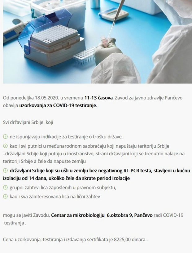 Testiranje će se vršiti u prostorijama Zavoda, tačnije Centru za mikrobiologiju (Ulica 6. oktobra 9, Pančevo), a cena uzorkovanja, testiranja i izdavanja sertifikata je 8.225 dinara.