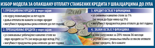 Izbor modela za olakšanu otplatu stambenih kredita u švajcarcima do jula. Ko ne prihvati nijedan predlog, vraćaće zajam po starim uslovima