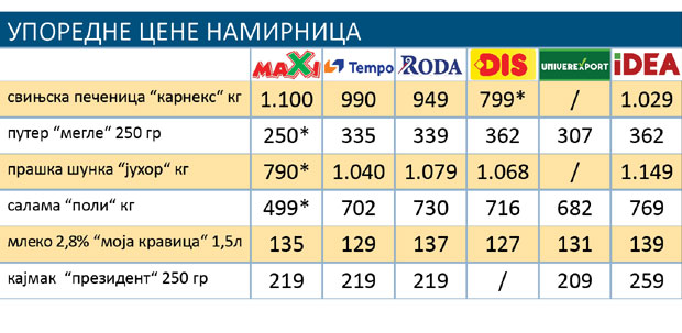 ANALIZA cena namirnica u vodećim trgovinskim lancima pokazuje da se osetno razlukuju od radnje do radnje. Čak i letimičan pogled na našu listu uporednih cena pokazuje velike oscilacije, ne samo kod akcijskih, već i redovnih cenovnika. Pre kupovine potrošači treba da obilaze radnje, jer razlike u ceni istih proizvoda, iste gramature idu i do 40 odsto.
