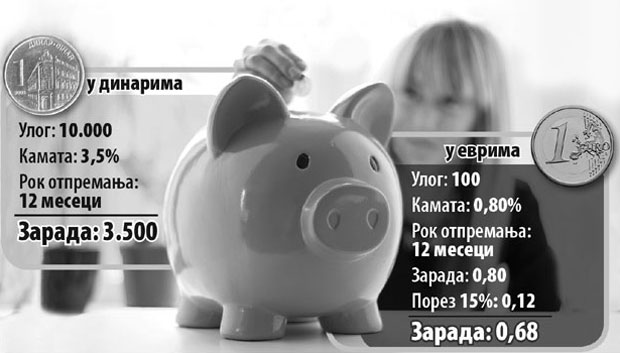 Tako, ako neko položi 10.000 dinara na godinu dana sa kamatom od 3,5 odsto, zaradiće 350 dinara posle isteka oročenja, a ukoliko stavi 100 evra sa kamatom od 0,80 odsto dobiće 80 centi. Na to mora da plati porez od 15 odsto, tako da mu preostaje, odnosno zaradio je 68 centi za 12 meseci.