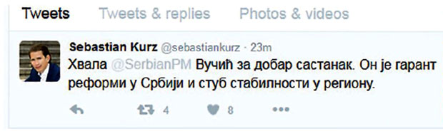 Kako se navodi u Akcionom planu, Austrija namerava da dalje gradi poziciju prvog stranog investitora u Srbiji. Kurc je svoje utiske podelio i na Tviteru i to na ćirilici (na slici).