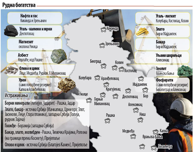 SRBIJA leži na oko dva miliona tona olova i cinka, više miliona tona bakra, oko 20 tona zlata i čak četiri milijarde tona uglja, a gotovo sve rude, osim uglja, iskopavaće narednih godina uglavnom privatne kompanije. Ukoliko se u sledećih deset godina otvori pet novih rudnika, kao što je planirano, našoj zemlji bi to trebalo da donese pet milijardi dolara stranih investicija i oko 1.000 novih radnih mesta.