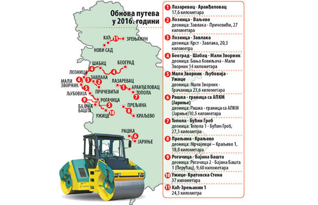 Tokom 2016. godine planirano je održavanje i otklanjanje oštećenja na putu Lazarevac - Aranđelovac 1, u dužini od 17,6 kilometara. Put od Loznice do Valjeva, u delu od Zavlake 2 do Pričevića rekonstruisaće "Putevi Užice", dok je na deonici od Krsta do Zavlake 2 angažovan "Ratko Mitrović - niskogradnja". U toku je i rekonstrukcija puta Beograd - Šabac - Mali Zvornik na deonici od Banje Koviljače do Malog Zvornika, gde rupe popravljaju "Putevi Užice".