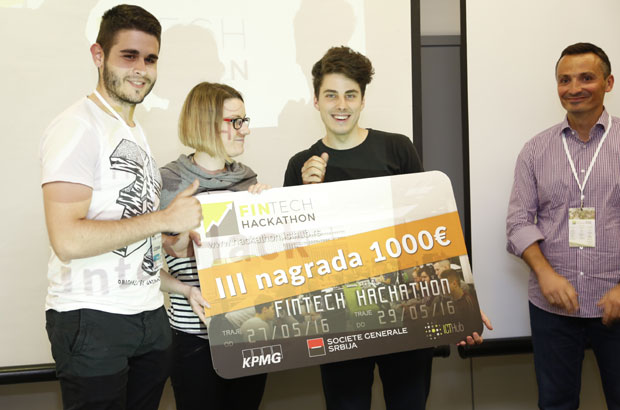 Na prvi srpski Fintech hackathon prijavilo se oko 150 ljudi, a odabrano je 16 timova koji su tokom samo 48 sati kreirali inovacije iz oblasti digitalnog bankarstva. Tri najbolja rešenja izabrao je stručni žiri u čijem sastavu su bili predstavnici Sosijete ženeral banke, ICT Hub-a i KPMG, kao i naši najuspešniji startap preduzetnici – Stefan Pajković, Lazar Stojković, Đorđe Filipović i Rade Joksimović.