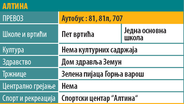 Nedostatak infrastukture i udaljenost od centra grada su faktori koji najviše obaraju cenu kvadrata u zemunskom naselju Altina. Na blagom uzvišenju sremske ravnice, 11 kilometara od centra, a pored auto-puta za Novi Sad, povezana je sa Novim Beogradom autobuskim linijama 81 i 81L, dok se bez presedanja do Zelenog venca može stići novijom linijom 707. Tako se stanovnici ovog naselja najviše žale na trajanje vožnje do centra grada, koja može da potraje i do sat vremena. Ovaj problem mogao bi da bude rešen predviđenom izgradnjom železničke stanice, koja će se koristiti za usluge gradske železnice BG voz.