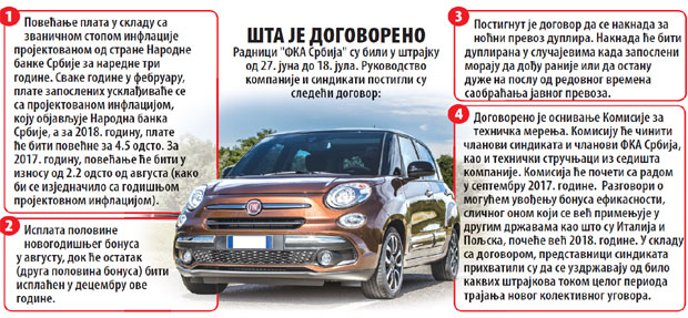 SPORAZUM između predstavnika samostalnog sindikata "Fijat Krejsler automobila Srbija" i poslovodstva ove kompanije, koji je u utorak potpisan u Vladi Srbije je rezultat kompromisa koji omogućava nastavak proizvodnje u kragujevačkoj fabrici automobila, veće plate i bolje uslove za radnike ali i nastavak dijaloga. Ovo je u utorak poručila premijerka Ana Brnabić pošto su na sporazum potpise stavili Silvija Verneti, generalna diorektorka FKA Srbija, i Zoran Marković, predsednik štrajkačkog odbora.