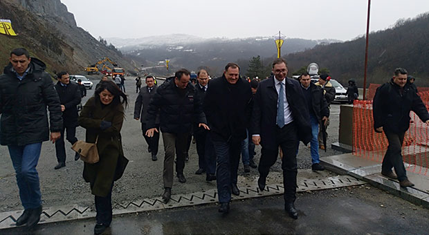 PREDSEDNIK Srbije Aleksandar Vučić je u pratnji Zorane Mihajlović, ministarke građevinarstva, saobraćaja i infrastrukture, v. d. direktora “Koridora Srbije” Zorana Babića i predsednika RS Milorada Dodika obišao radove na izgradnji južnog kraka Koridora 10 kroz Grdeličku klisuru.
