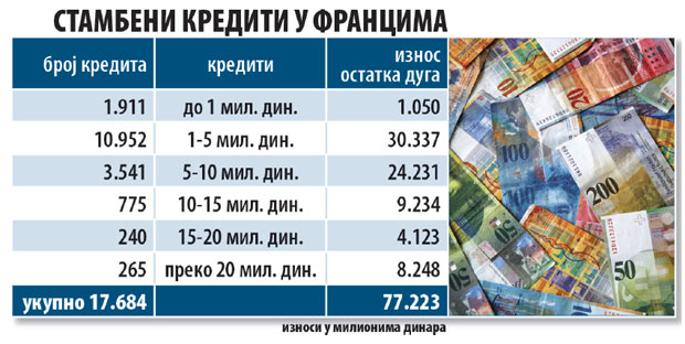 Kroz zajmove u "švajcarcima", u našoj zemlji se trenutno otplaćuju ukupno 17.684 stana. Njihovi vlasnici, prema podacima Udruženja, bankama treba da vrate još 77,22 milijarde dinara. Ovi dužnici u proteklom periodu suočili su se sa velikim problemom u otplati, s obzirom da je franak ojačao prema evru, što je gotovo udvostručilo glavnice njihovih kredita. Nezadovoljni sa ponuđenim načinima rešavanja svog problema od strane banaka (reč je o četiri modela rešenja koje je omogućila Narodna banka Srbije), većina ovih dužnika nije htela da sa bankama sklapa dodatne anekse ugovora. Očekuju da će njihova udruženja izdejstvovati povoljnija rešenja.