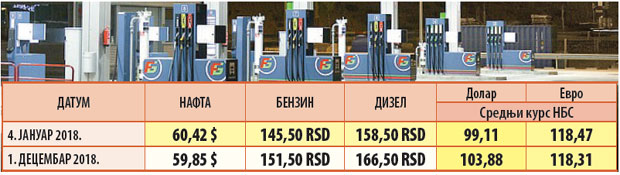 Analiza "Novosti" je pokazala da je početkom ove godine barel sirove nafte tipa brent koštao na svetskim tržištima 60,42 (u petak 59,85) dolara. Dizel je prvih dana januara koštao 145,50 (u petak 165,50), a benzin 145,50 (151,50) dinara za litar. Evro je na približno istom nivou kao i početkom godine (118,47 u januaru 118,31 u petak), dok je vrednost dolara u odnosu na januar veća za četiri dinara (99,11-103,88).
