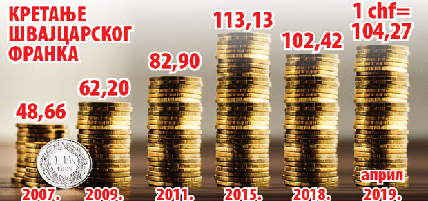 BROJ građana koji otplaćuje kredite u švajcarskim francima je trenutno 16.800. Podaci zaduženih idu i do 37.000 porodica koje su se u pretkriznom periodu zaduživale u ovoj valuti. Lanjski podaci Kreditnog biroa barataju sa ukupno 17.684 stambena kredita u francima (januar 2018) vrednih 77 milijardi dinara (763 miliona evra).
