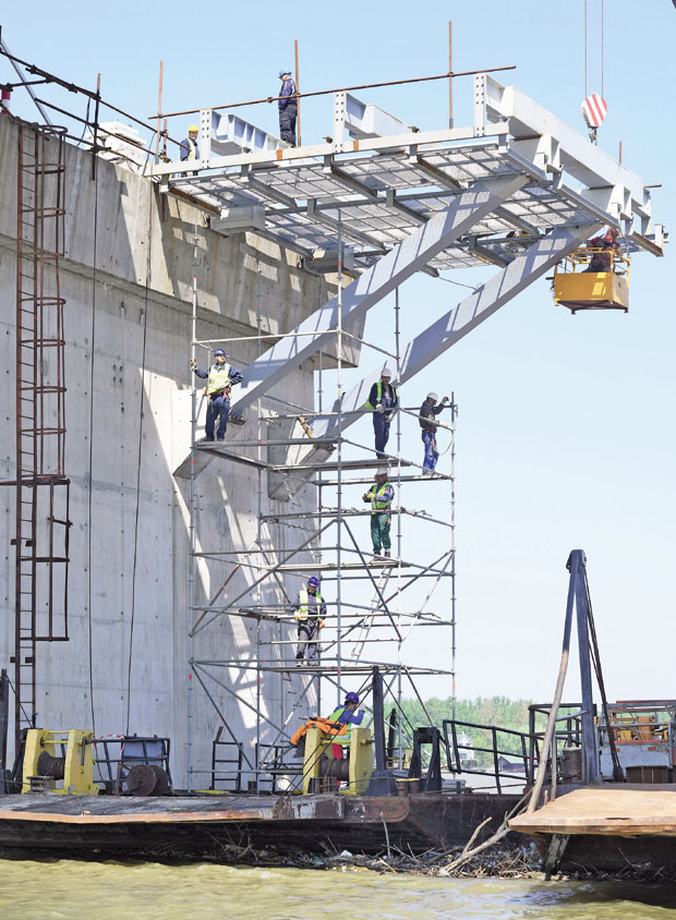 ČELIČNE konstrukcije, izgrađene u brodogradilištu dugačke su 80 metara, široke 12, visoke šest metara i ukupne težine 550 tona - kaže inženjer Jocić. - Nakon svih provera, neophodnih dozvola za plovni objekat, porinut u vodu i na kraju prevučen do mesta ugradnje, zarotiran u pravcu ugradnje na mestu podizanja, oslobođen brodskih delova i opreme i prihvaćen užadima na četiri mesta. Montaža je trajala 16 sati! Podizanjem ove konstrukcije pre desetak dana, završena je treća faza izgradnje leve trake mosta preko reke Save kod Ostružnice. Podignut je na visinu od 18 metara i precizno podešen u odnosu na već postojeće montažne komade na stubovima.