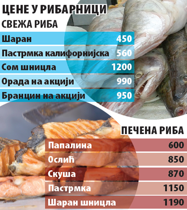 Šaran i pastrmka se uglavnom svuda prodaju od 420 do 500 dinara. Sveže šnicle soma, orada i brancin su skuplji i njihova cena u ribarnicama se kreće od 1.000 do 1.200 dinara za kilogram, dok se u trgovinskim lancima na akciji ova morska riba može naći od 780 do 830 dinara. Najskuplji je losos, čiji fileti koštaju oko 2.000 dinara.