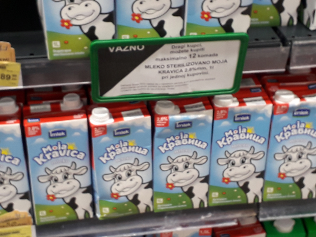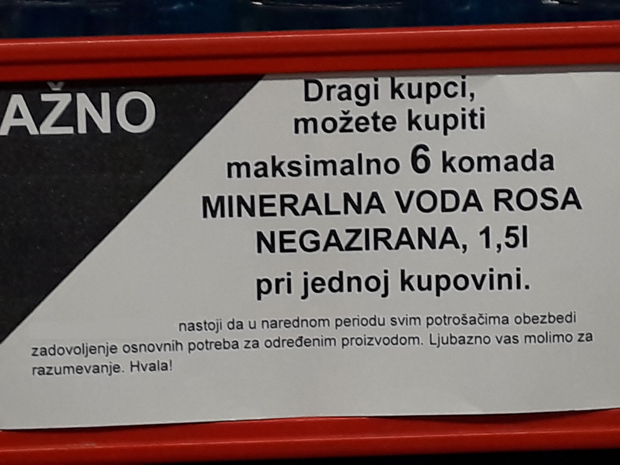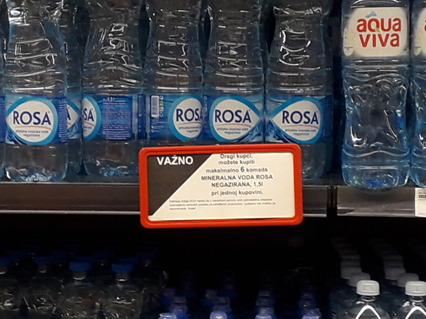 Kako bi se sprečilo da pojedinci nepotrebnim stvaranjem kućnih zaliha izazovu poremećaj na tržištu, trgovci su odredili da se pri jednoj kupovini može pazariti do šest flaša od litar i po „obične“ vode, do šest litara zejtina, do šest kilograma brašna i kristal šećera, do 12 litara dugotrajnog mleka.