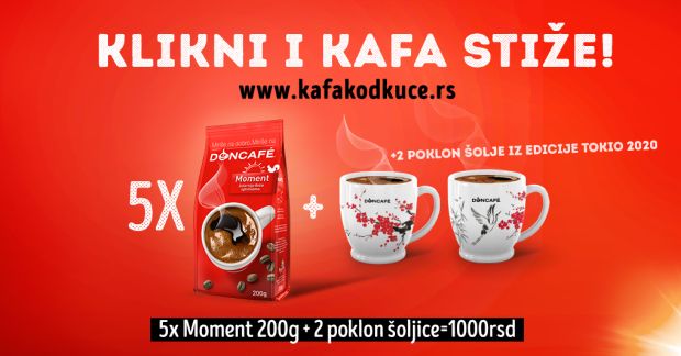 Ukoliko želite da vam dan i dalje počinje uz omiljenu dozu jutarnjeg optimizma, zagarnatovano uživanje kod kuće pružiće vam paket Moment izlazećeg sunca u kojem se nalazi 5 kesica Doncafé Moment kafe od 200 grama i dve poklon šoljice iz limitirane edicije Tokio 2020.