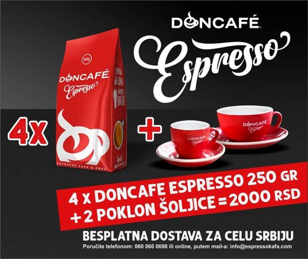 Ako ste se uželeli vrhunskog espressa, dok ne rade restorani, kafeterije i kafići, Doncafé vam omogućava i to uživanje – kod kuće! Osmislili su paket od četiri pakovanja Doncafé espresso kafe od 250g koji sadrži i dve crvene šoljice, a stiže besplatno na vašu kućnu adresu. Sada opet možete da popijte šoljicu omiljenog jutarnjeg napitka sa ukućanima ili prijateljima onlajn i uživate u savršenom balansu, jačini, intenzivnoj aromi i stabilnoj kremastoj peni. Sećate se trenutka kada osetite onu slatkoću pečenog lešnika ili aromu citrusa? Obezbedite svoje uživanje u omiljenom espressu pozivom na 060-060-0698 ili slanjem maila na info@espressokafa.com.