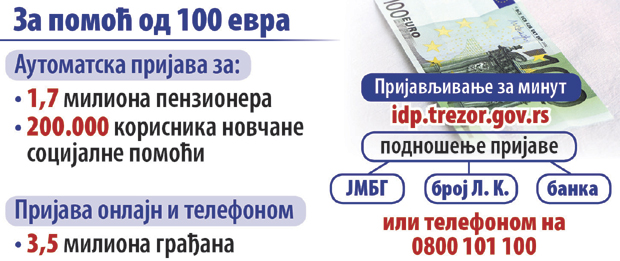 Ostali punoletni državljani Srbije, sa važećom ličnom kartom i aktivnim prebivalištem u našoj zemlji, od pre dva dana za pomoć od 100 evra prijavljuju se preko portala Uprave za trezor idp.trezor.gov.rs. Od jutros imaju još jednu opciju, mogu da ostave podatke i preko broja telefona kol centra Uprave za trezor - 0800 101 100. U oba slučaja, neophodni podaci su JMBG, broj lične karte i banka u kojoj imaju ili žele da im se otvori račun.