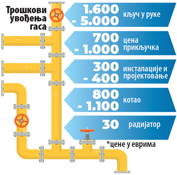 Ako se pretpostavi da je gas stigao do nekog kraja, cena uvođenja do stana zavisi od priključka, nabavke, kotla, radijatora, rada na instalacijama, projektu, dokumentaciji. U našoj zemlji postoji oko 30 distributera prirodnog gasa. Kako distributeri nezvanično kažu, cena po kojoj "Srbijagas" isporučuje ovaj energent je 36 dinara.