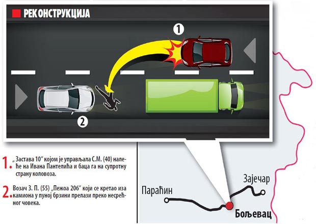 Kako saznajemo, Pantelić se, iz neutvrđenih razloga, kretao sredinom magistralnog puta. Na njega je, najpre, naletela "zastava 10", kojom je upravljala S. M. (40). Udarac je čoveka odbacio na drugu stranu kolovoza, pravo pod točkove "pežoa 206", kojim je upravljao Z. P. (55).