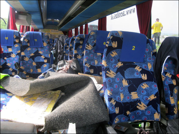 Pored njihovih beživotnih tela, na travi je bio krvi, polomljena šoferšajbna autobusa, garderoba putnika... Iz autobusa je ispao i tahograf.