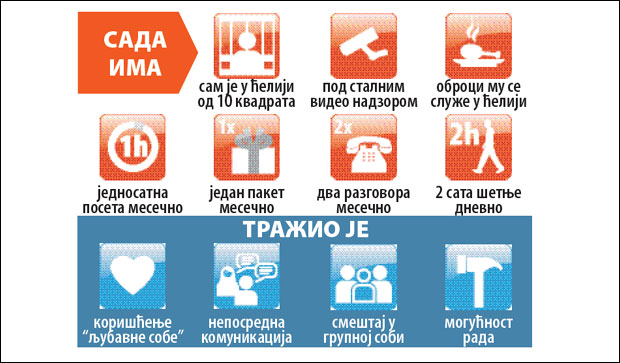 Podsetimo, Legija je tražio premeštaj u drugi zatvor gde bi imao pravo na češće posete i neposrednu komunikaciju sa osobama koje ga posećuju, jednom u dva meseca korišćenje takozvane "ljubavne sobe" i mogućnost da bude smešten u grupnu sobu, da nešto radi...
