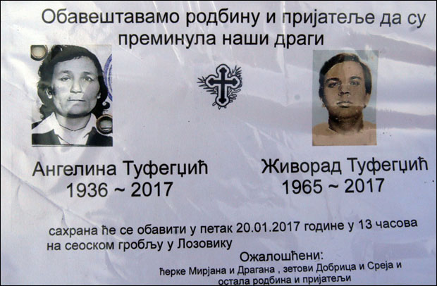U porodičnoj kući u Lozoviku kod Velike Plane pronađena tela Ageline (80) i Živorada (51) Tufegdžića. Nisu imali primanja. U kući nema telefona, a struja im isključena još pre pet godina