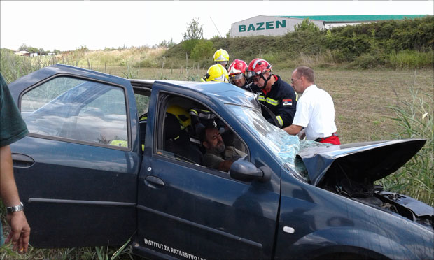 Od siline udara, vozila su se zarotirala, a "dačija" je sletela sa puta. Vatrogasna jedinica punih 45 minuta borila se da izvuče prikleštenog vozača iz automobila.