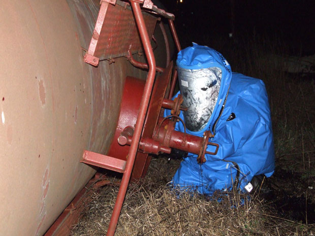 Poslednje dve cisterne ispale su iz koloseka kod skretnice i prevrnule se na levi bok. Od siline udarca, centralni ventili su popustili na obe, pa su iz njih iscurile izvesne količine ove opasne materije.
