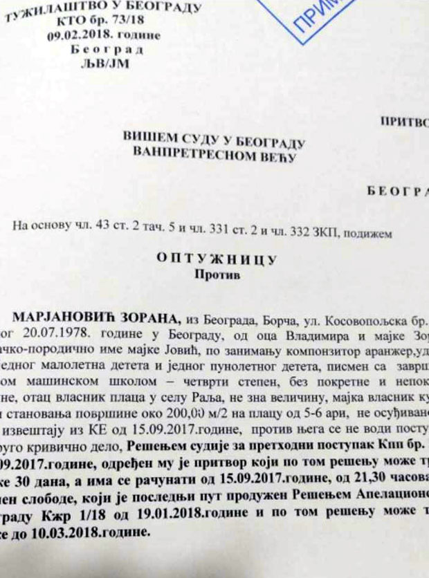 - U analizi kretanja telefona Uroša, Miloša i Vladimira Marjanovića, Zoranovog sina, brata i oca, može se zaključiti da su sva trojica u vreme koje bi praktično odgovaralo vremenu ubistva, oko 17 časova, bili ili isključeni ili nisu imali bilo kakvo kretanje koje se može pratiti - navodi se u optužnici.