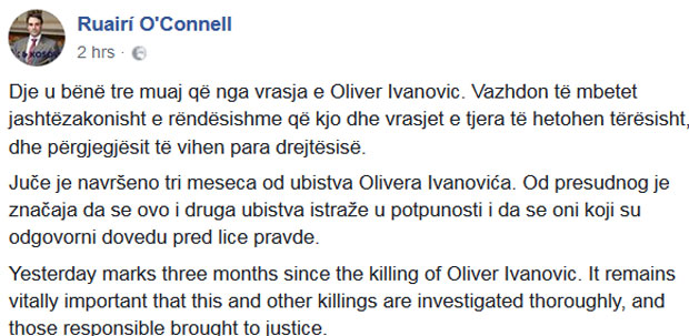 O`Konel je na svom Fejsbuk nalogu napisao da je izuzetno važno da se ne samo to ubistvo, već i ubistva drugih temeljno istraže, i počinioci pronađu.