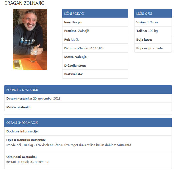 Dragan Zolnajić (53) iz Subotice od utorka, 20. novembra, prepodne zvanično se vodi kao nestao, dok je njegova supruga Svetlana Zolnajić (46) nestala u petak popodne, 16. novembra.